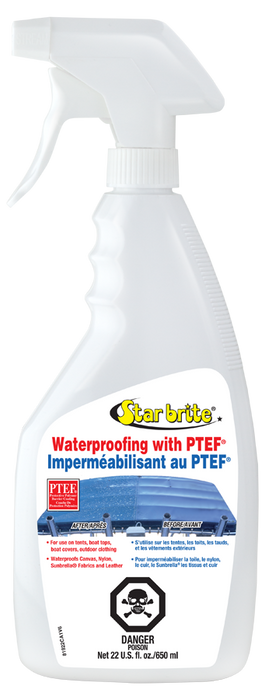 Star brite Waterproofing with PTEF restores water repellency to virtually all marine fabrics from boat covers to Bimini tops. It is also the easiest, most effective way to waterproof car covers, tents, tarps, foul weather gear, convertible tops and more. Star brite Waterproofing is also great for use on new fabrics, greatly extending their service life by providing an additional barrier to moisture and damaging UV rays. It's easy to use; simply spray the fabric to be restored and allow it to dry for 6 Hours before use. Always apply Waterproofing outdoors, taking care to not breathe the solution.
